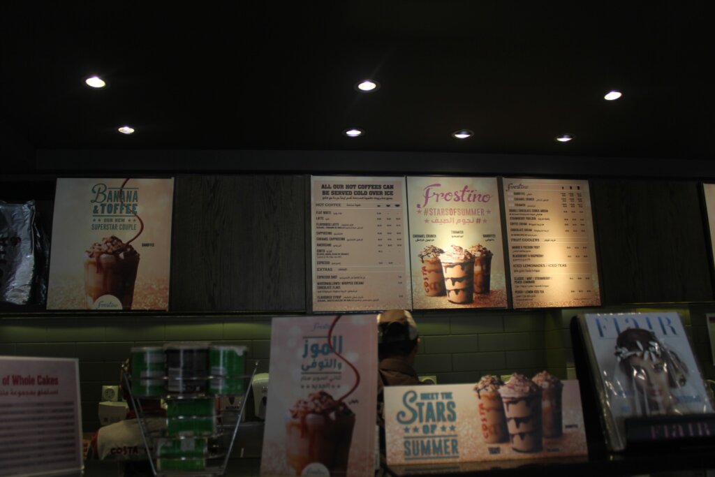 At Costa Coffee, we ordered a giant iced Americano and a mid-sized tiramisu.
