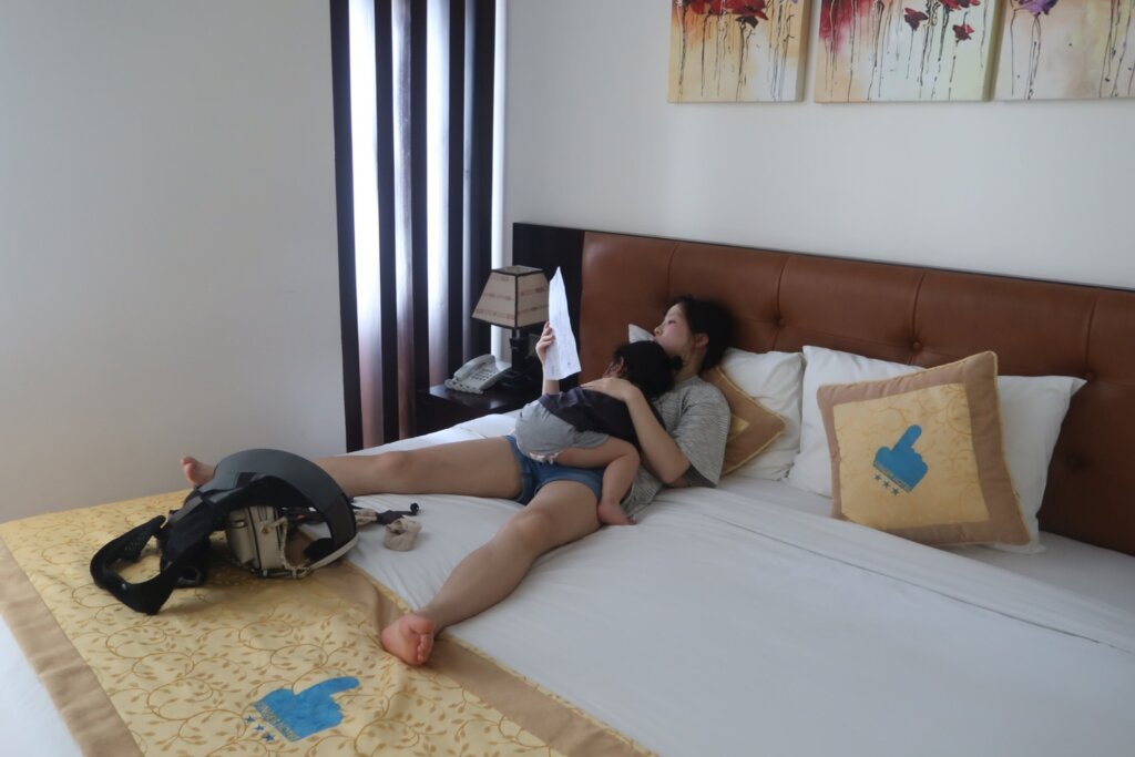However, with Sweetie asleep and the sun blazing down, Julie couldnโt manage the load over the 700 meters to the hotel. So, we quickly revised our strategy: