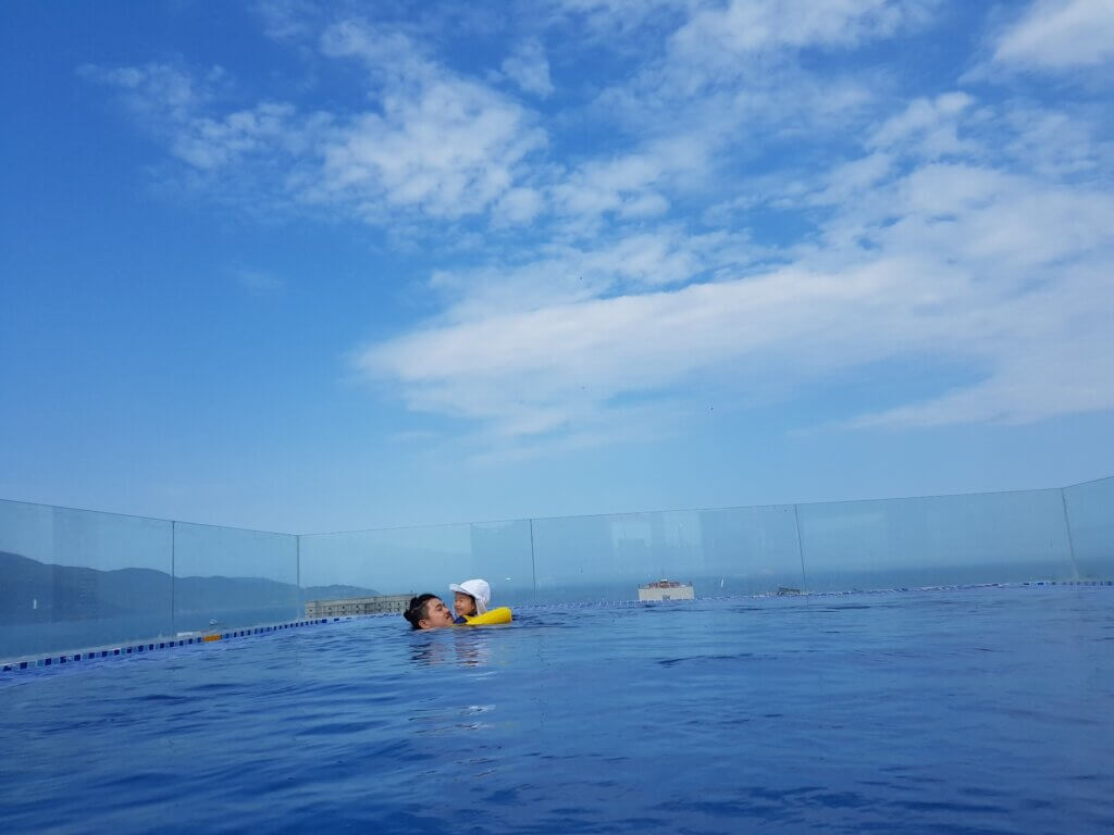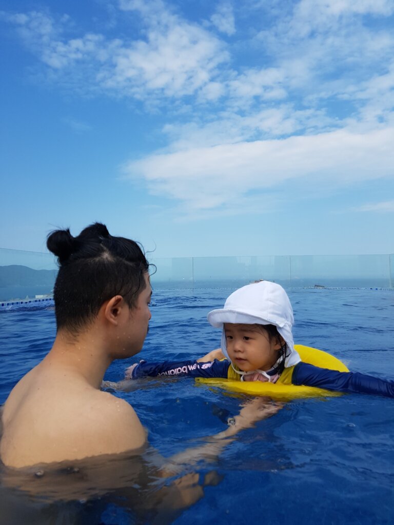 Once settled, we headed up to the rooftop pool. The view of My Khe Beach from the pool was stunning, and the cool water refreshed all of us. Sweetieโs energy returned as she paddled in the water, and we couldnโt help but smile as other guests marveled at her cuteness, comparing her to a doll.
