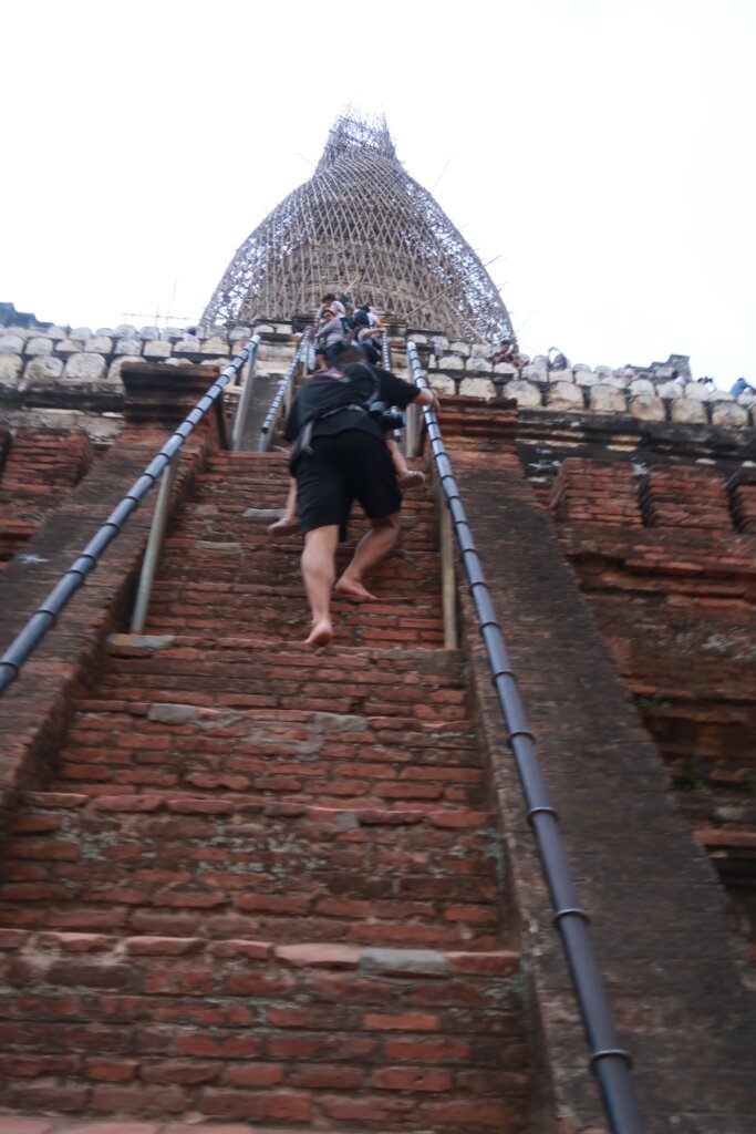 Hoping to catch the famous Bagan sunset, we initially headed to Pyathada Pagoda, only to discover that climbing it was no longer allowed. As rainclouds and lightning loomed, we quickly diverted to Shwesandaw Pagoda, where we caught a fleeting glimpse of the sun disappearing behind the horizon.