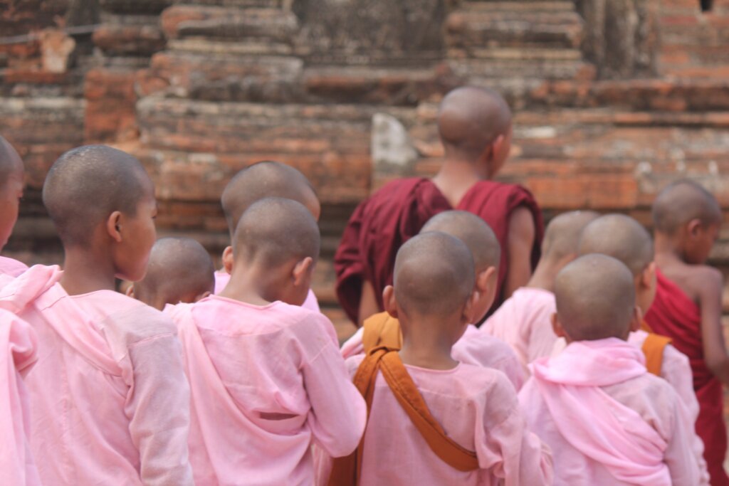 At Dhammayazaka, we came across a group of novice monks (๋์์ค๋). One tiny monk followed his teacher, his robe swishing as he walked, looking curious and joyful.