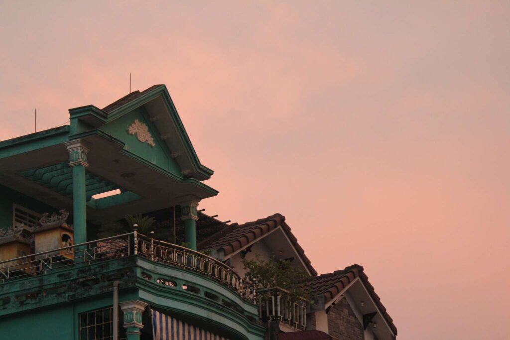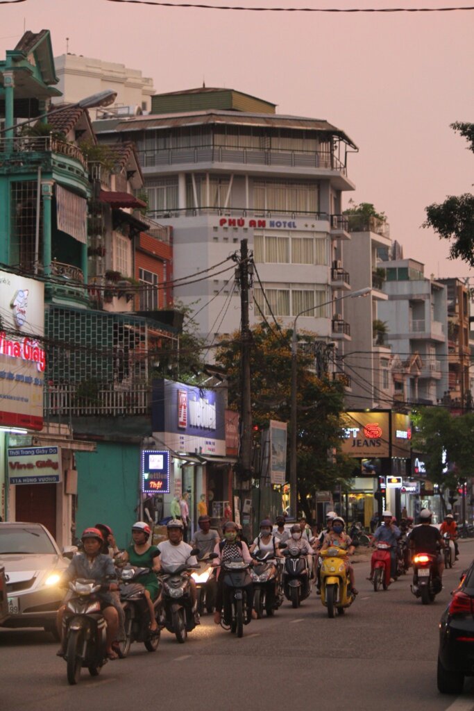 Once refreshed, we ventured out to explore Hue’s streets. Hue felt distinct from Da Nang or Ho Chi Minh City, with its quieter roads, fewer motorbikes, and an abundance of cyclos. The architecture blended old-world charm with vibrant street life, and as dusk settled, the sky turned a soft pink, perfectly framing the city’s iconic tile-roofed buildings.