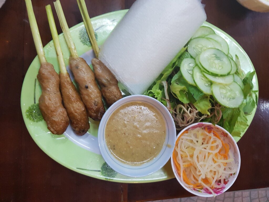 - Nem Lui: Minced, spiced pork skewers wrapped in rice paper with vegetables and dipped in a peanut-based sauce (40,000 VND, ~$2).