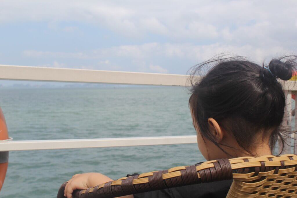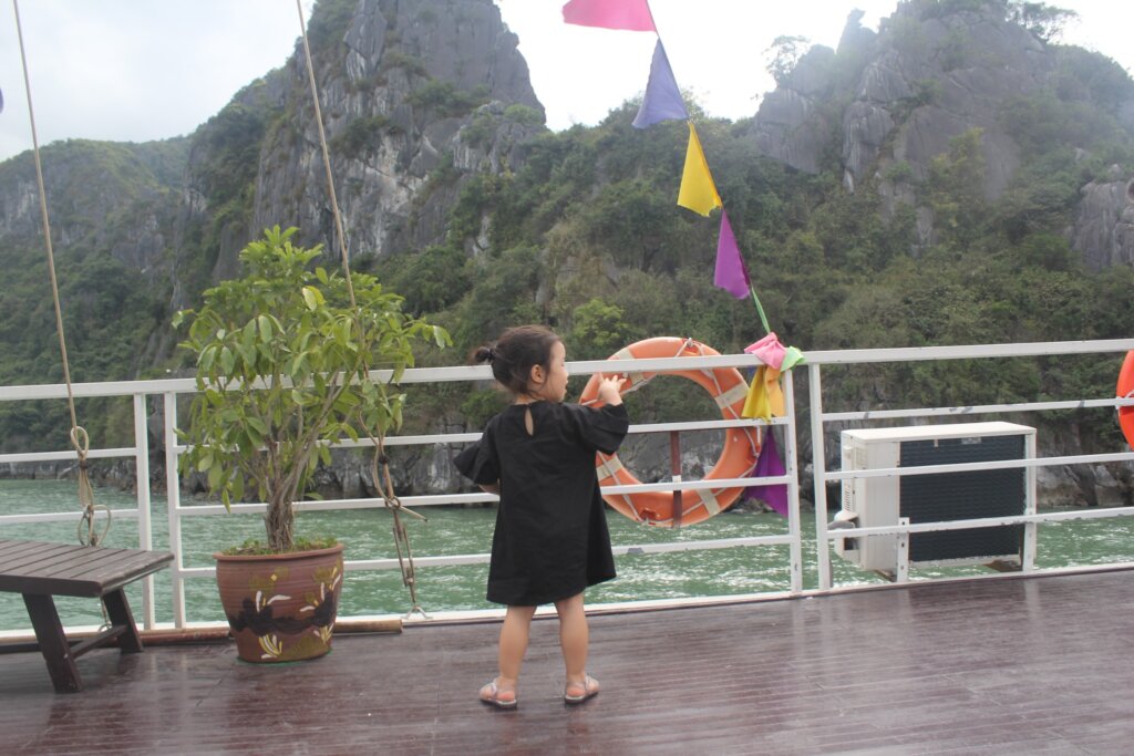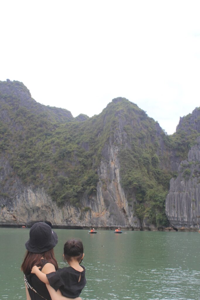 One of the day’s highlights was the bamboo boat ride. These small, hand-rowed boats wove through hidden caves and floating limestone formations, offering a peaceful and scenic perspective of Ha Long Bay. Sweetie was thrilled, her wide eyes soaking in every detail. Julie managed to snap a precious photo of her enjoying the ride.