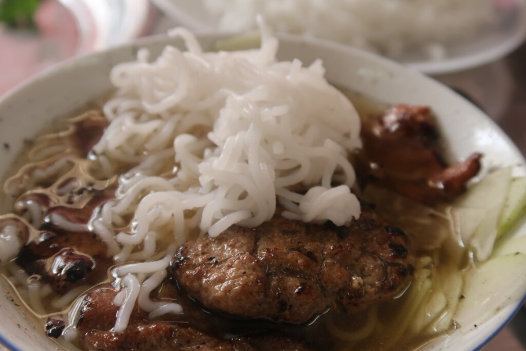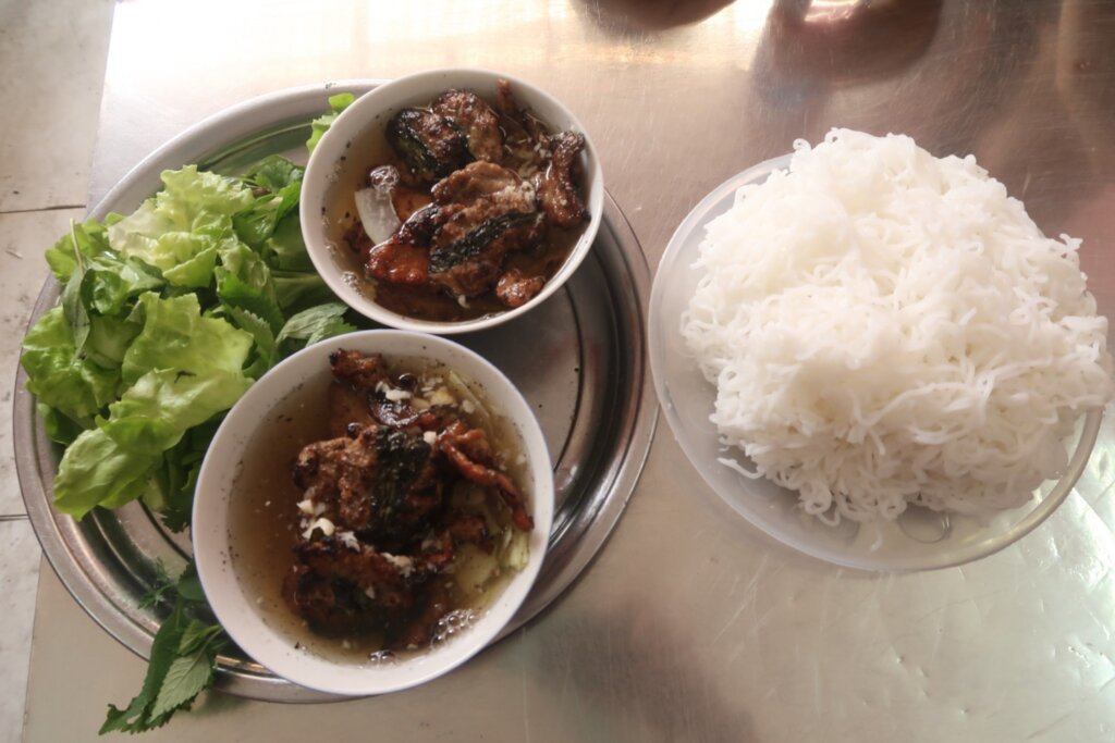While weโd enjoyed Bun Thit Nuong in central Vietnam, the experience was different. Bun Thit Nuong is similar to a noodle salad where ingredients are mixed together, like Koreaโs bibim-guksu. In contrast, Bun Cha feels interactive: dipping noodles, pork, and veggies into the sauce adds an engaging touch to the meal. Both dishes are delightful, but the smokiness and abundance of grilled pork in Bun Cha made it stand out.