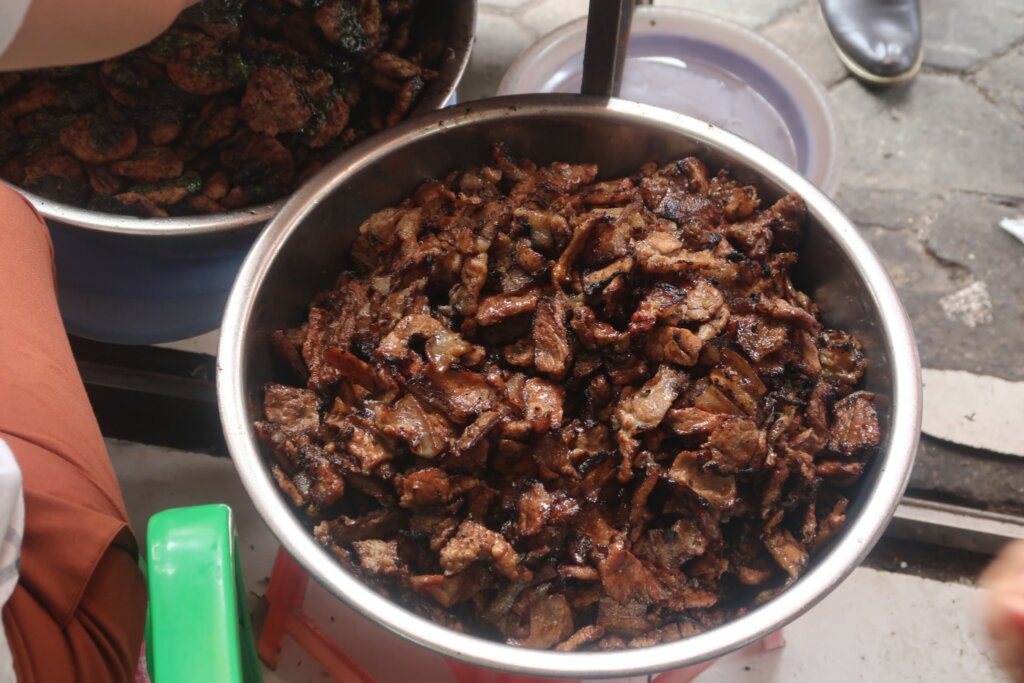 The restaurant announced itself with the irresistible aroma of charcoal-grilled pork wafting through the streets. Smoke poured out onto the road, guiding us to its simple, street-side setupโa hallmark of Hanoiโs bustling food culture.