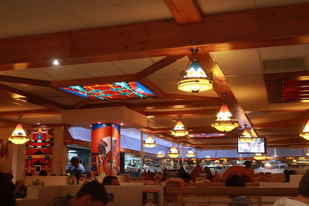 The restaurant had an interesting Western Native American-themed decor, with dim lights creating a cozy atmosphere.