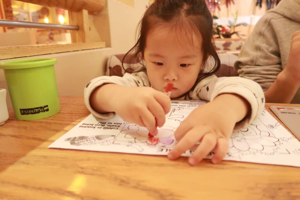 As we waited for our food, a kind staff member brought coloring books and crayons for Sweetie. She was delighted and started coloring happily.