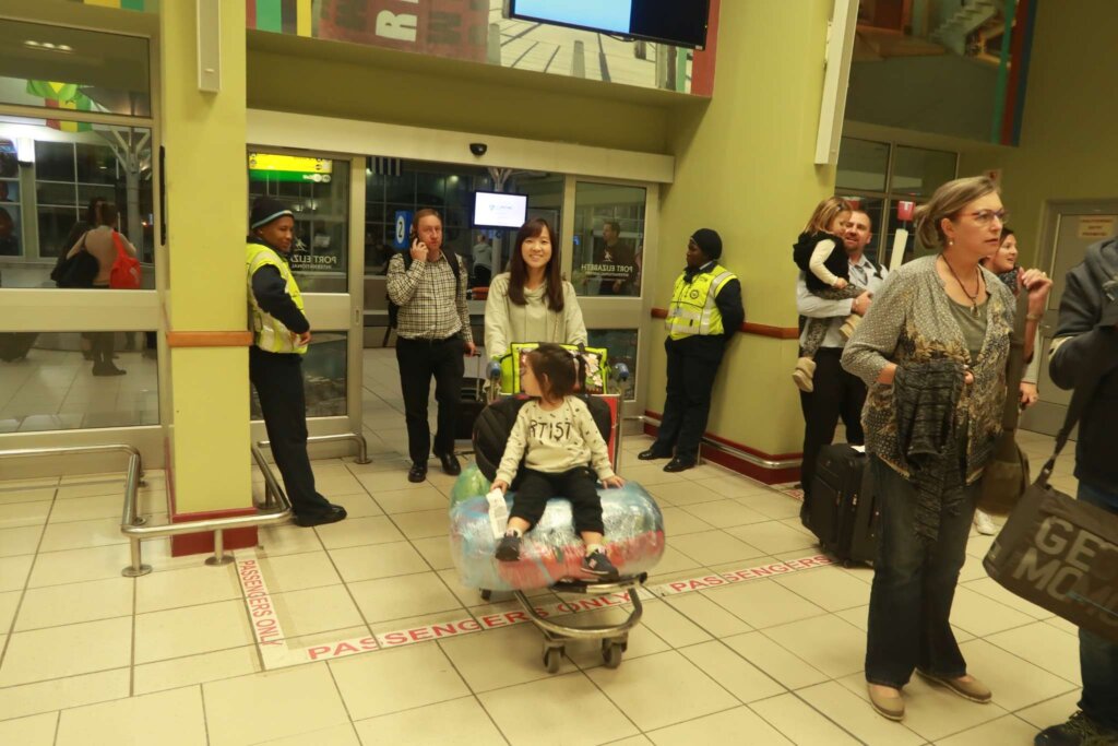 Traveling through Johannesburg Airport with a baby meant an overnight stay, baggage wrapping, security concerns, and a long layover before flying to Port Elizabeth.