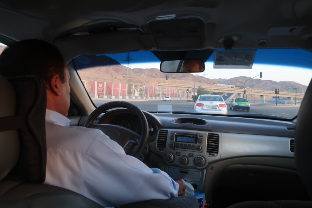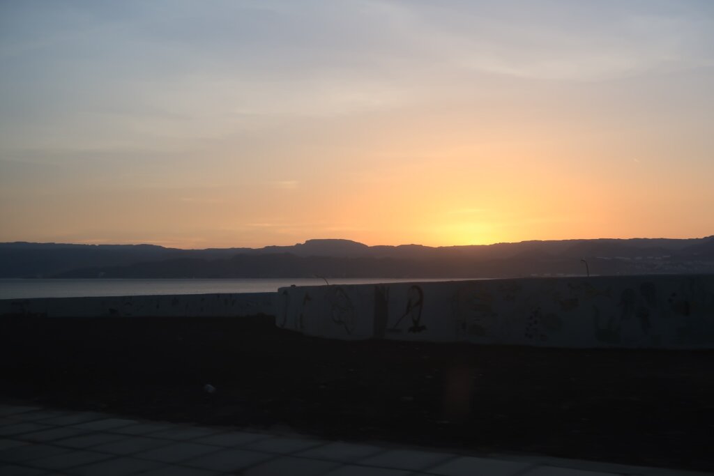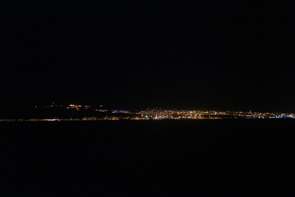 At exactly 7:30 PM, our trusted taxi driver arrived as promised in front of the McDonald’s in Aqaba to take us to the port. The sun was just beginning to set as we left the city, casting golden reflections across the Red Sea. In the distance, between two tall white hotels, we could see the border between Israel and Egypt. The right side belonged to Israel, clearly marked by its urban lights.