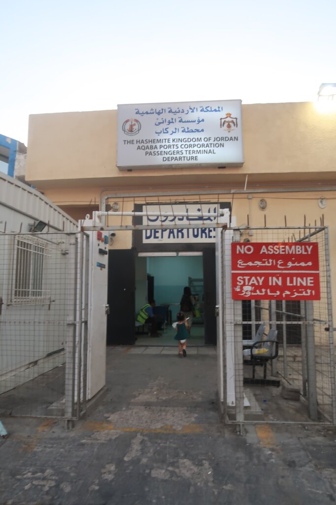 When we arrived at the Aqaba port, the process began immediately. First, we had to pay the mandatory Jordanian departure tax—10 dinars per person, even for Sweetie. We waited a long time at the tax window because no one was there. After finally paying, we were given several documents that we had to show repeatedly, all the way until we boarded the ferry. We held onto them tightly.