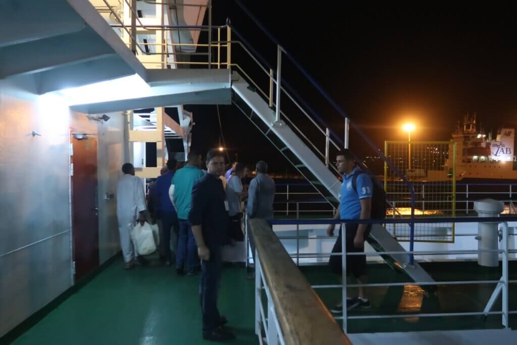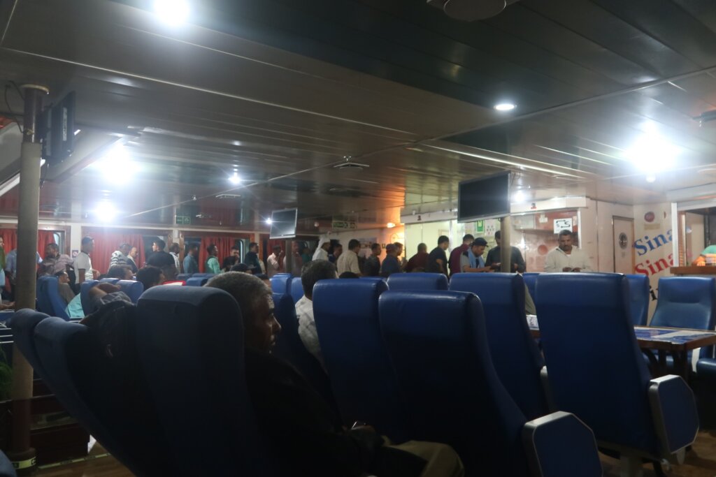 Finally, at 10 PM, an announcement came. We headed toward the ferry with our new companions. Unlike the ferry we had taken from Egypt to Jordan, this one didn’t have a first-class section. Perhaps that’s why the ticket price was cheaper—just $75 per adult. Still, the ferry was large and functional.