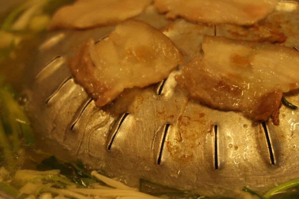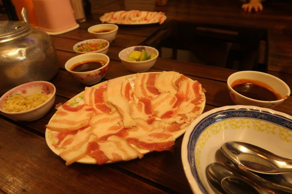 We ordered a 2-person portion of Sin Dat, priced at 39,000 kip (about 5,460 KRW per serving). The setup was unique: a combination of grilling and shabu-shabu. A shallow pot with a built-in grill was placed on the table. The edges were filled with broth, and the center was used to grill thinly sliced pork belly.