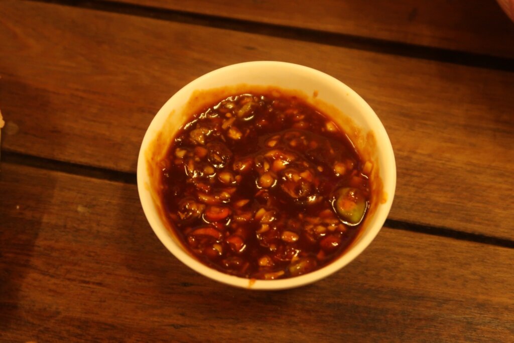 The fun began when we started creating our own dipping sauces. A base sauce, reminiscent of a peanut and soybean paste, was available. From there, we added garlic, chili, and lime juice to suit our tastes. I held back on the chili, keeping Sweetie’s palate in mind.