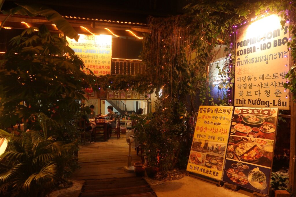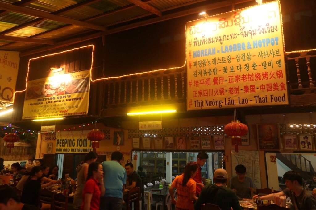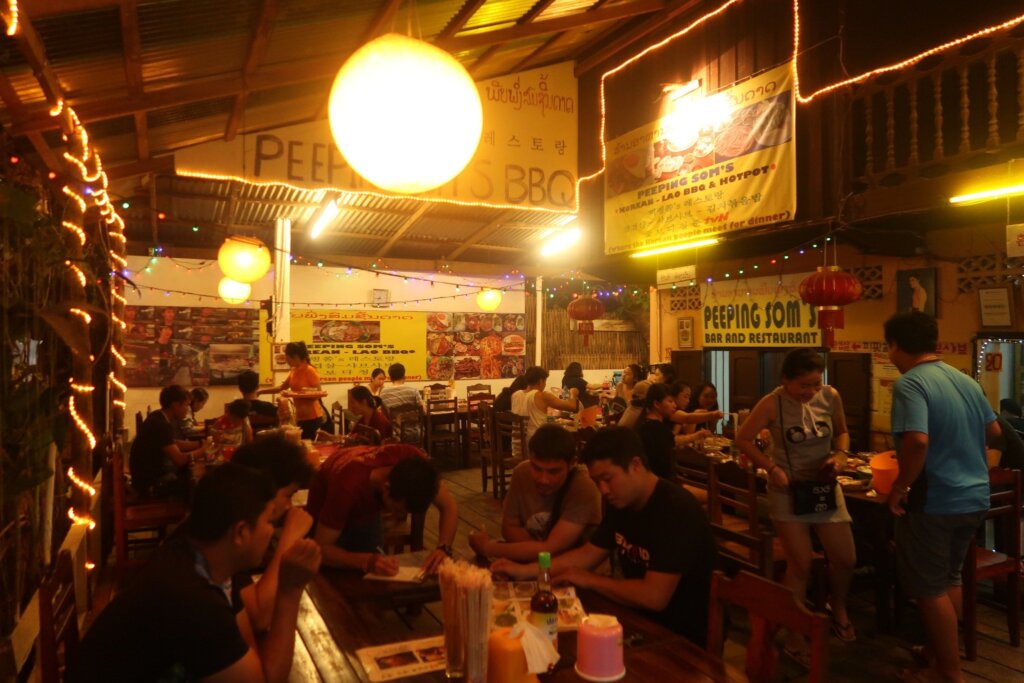 - Peeping Som’s BBQ: This restaurant is easy to find on the main street of Vang Vieng. It’s popular among tourists, so you might want to visit during off-peak hours to avoid long waits.
