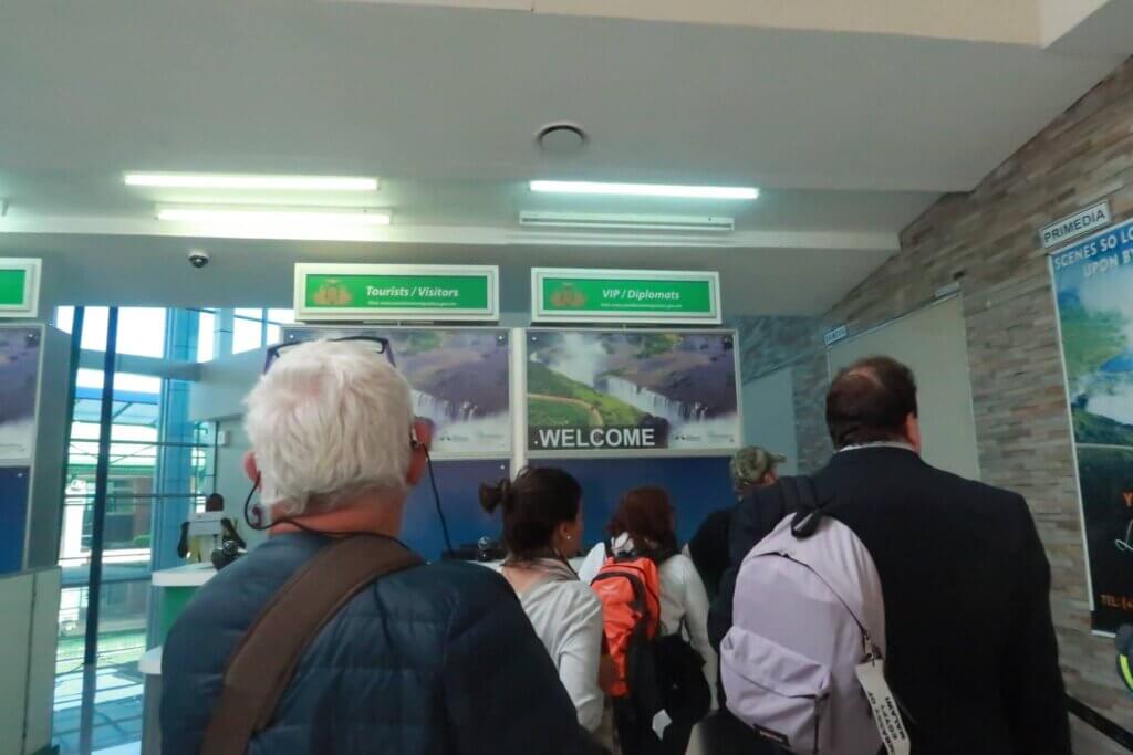Right at immigration, travelers were split into three lines: tour groups, Zambia-only visitors, and those visiting both Zambia and Zimbabwe. We got in the rightmost lane to apply for the KAZA UniVisa, which covers both countries.
