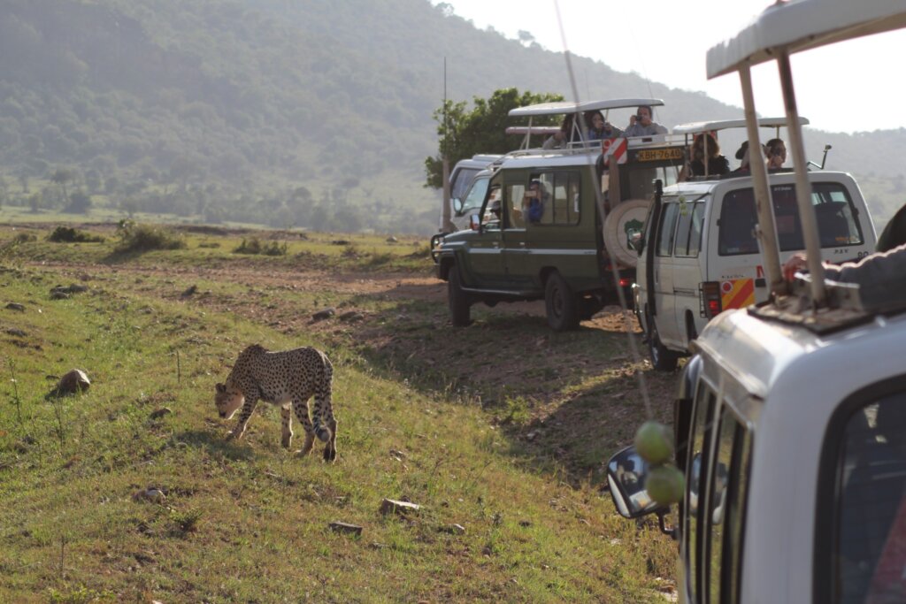 We were lucky. Unlike leopards, which have more round spots and no black tear marks on their faces, cheetahs have distinct black lines running down from their eyes, and that’s how we knew for sure. They walked with such elegance—lean, focused, completely indifferent to the excited crowd of humans watching.