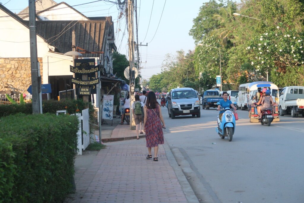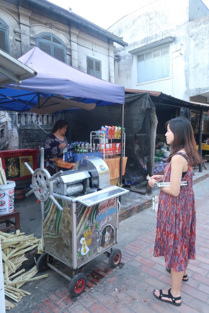 We left our guesthouse about 90 minutes before sunset. The streets of Luang Prabang had become familiar, and we walked at an easy pace, savoring the bustling energy of this serene town. Along the way, we stopped at a small stall to grab sugarcane juice for 5,000 Kip (about $0.60). It’s a local must-try—refreshing, affordable, and Sweetie loved it too!