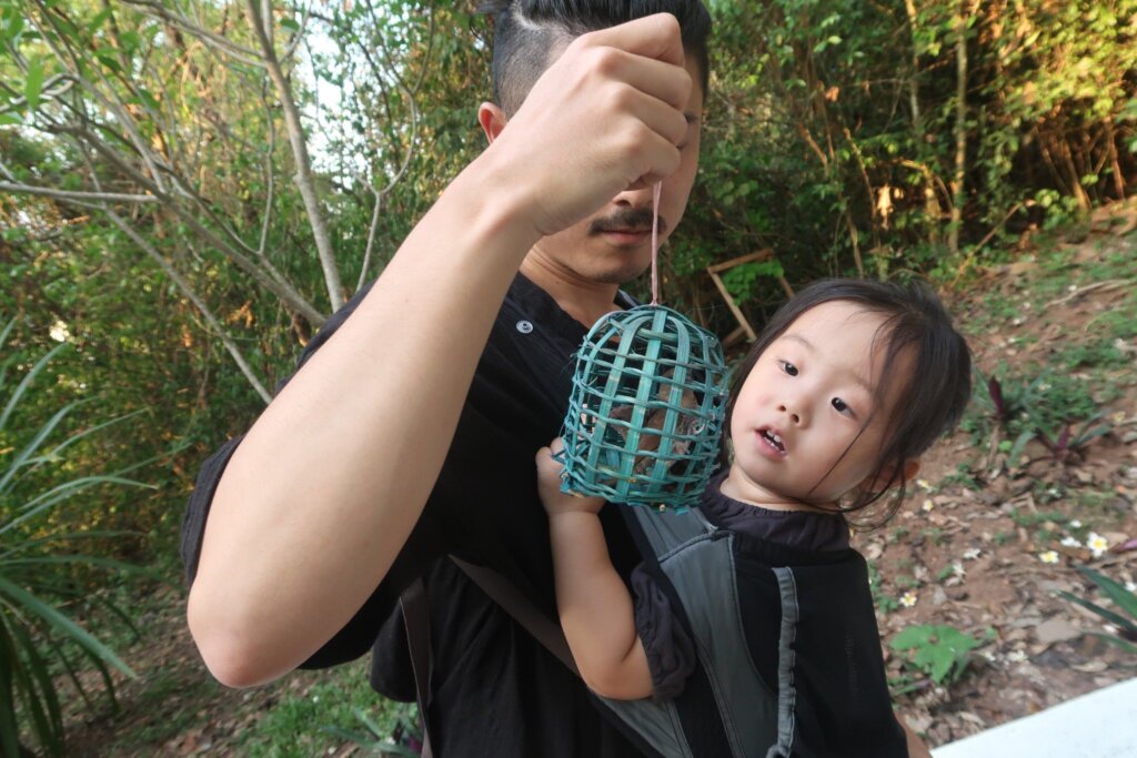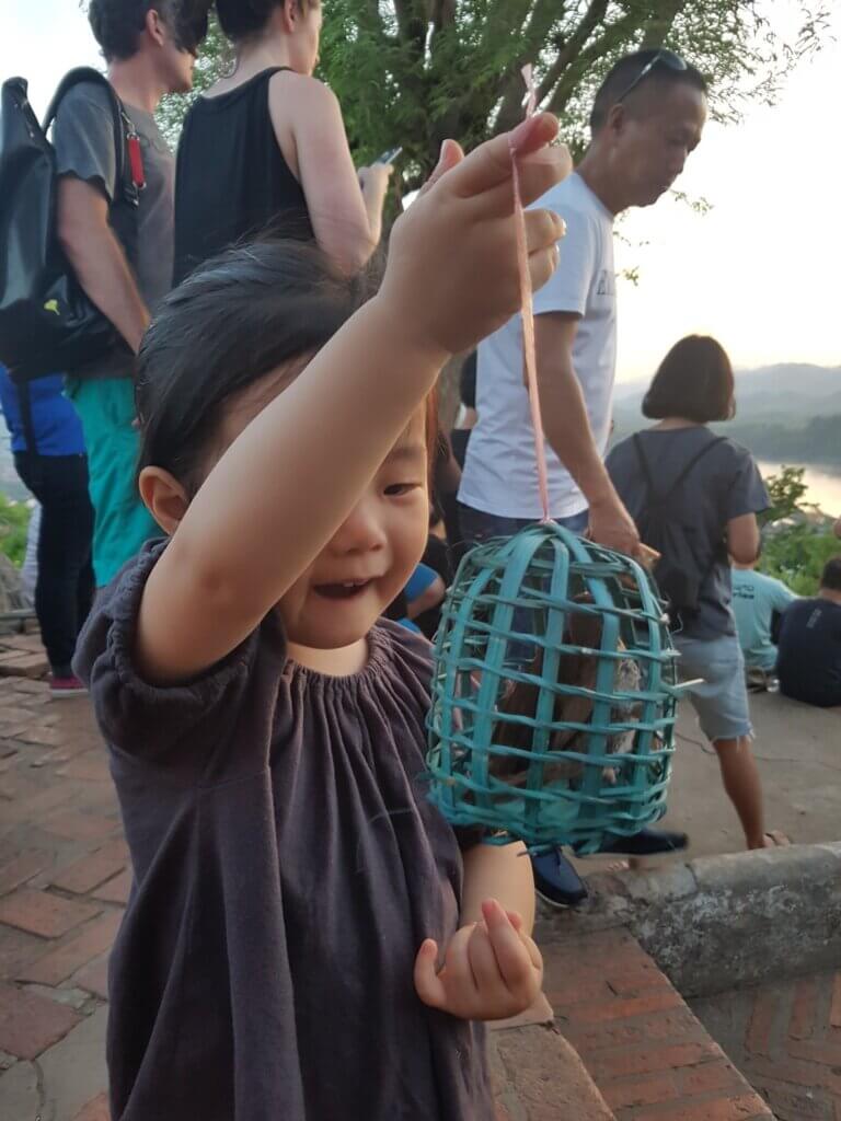 As the sun began its descent, painting the sky in hues of orange and pink, we took in the view of Luang Prabang from above. Sweetie, however, was too busy with her “chirp-chirp friends” to care about the sunset. After the sun dipped below the horizon, it was time for the big moment: releasing the birds. We reminded Sweetie that the birds were eager to soar freely, and she happily opened the cage, sending them off into the colorful evening sky.