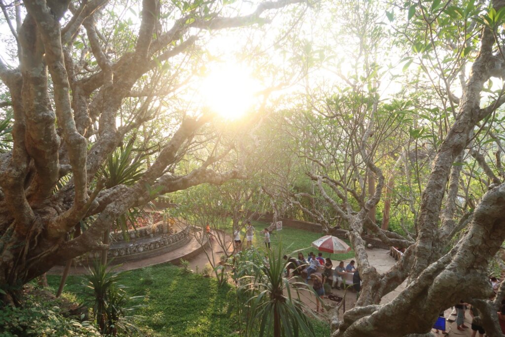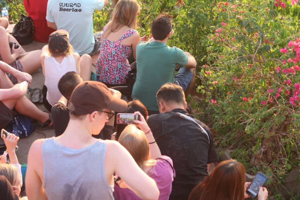 The climb was more like a stroll than a hike—a modest incline perfect for families. We purchased our tickets (20,000 Kip per adult; free for children) and began the ascent. Despite starting early, the best spots at the top were already claimed by eager photographers and sunset chasers. Still, we found a cozy place to sit and waited.