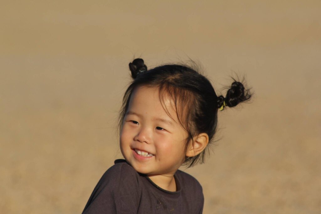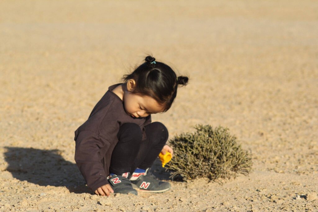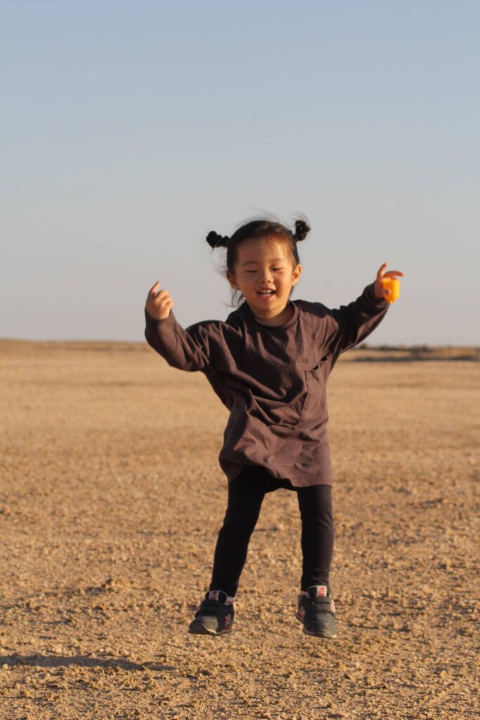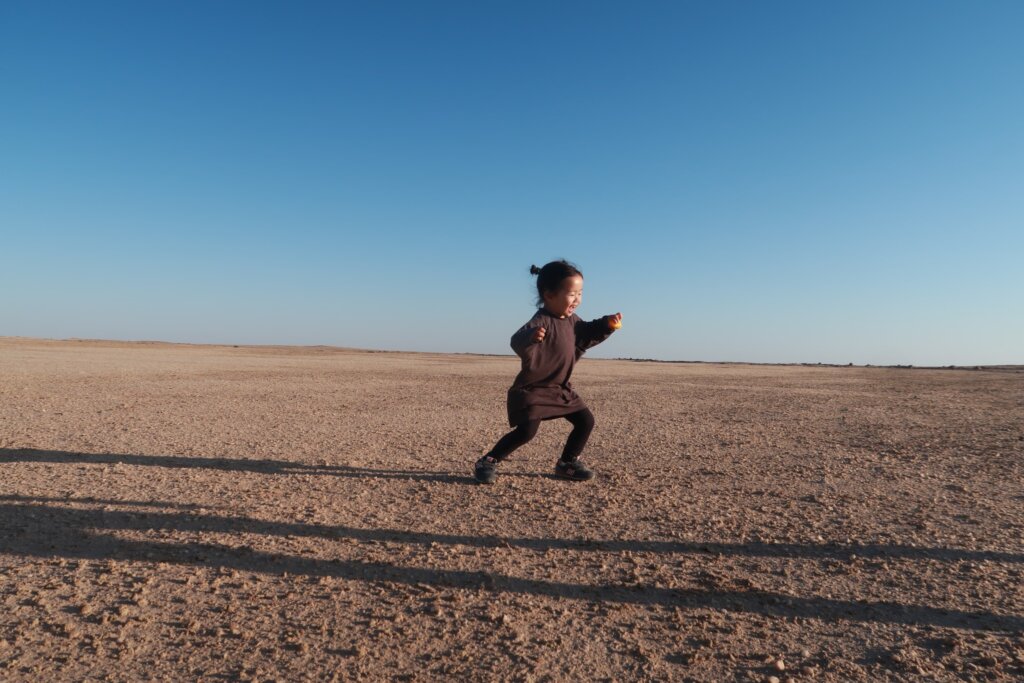 Sweetie ran across the flat land, laughing and jumping, soaking in the freedom. She played with a lone tuft of grass, touched the shimmering stones, and kept giggling with each new discovery. In the middle of this quiet desert, her joy echoed.