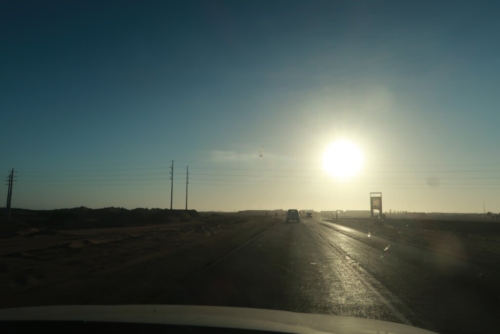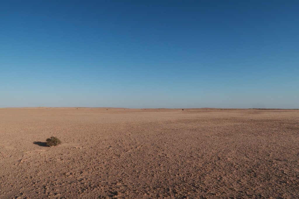 Leaving the green patches behind, the landscape started turning stark and bare again. Trees disappeared, and we were suddenly surrounded by a vast emptiness—no dunes, no bushes, no signs of life for miles. We had entered Dorob National Park, and it looked like a sci-fi version of a desert plain.