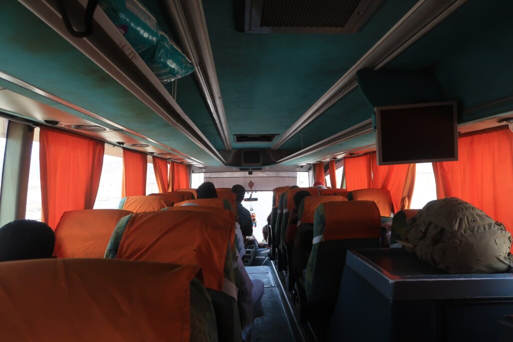At 11:10 a.m., our bus finally arrived. This bus was traveling from Sharm El Sheikh, passing through Dahab, then heading to Nuweiba and further to Taba. We got on, and within minutes, the exhaustion hit. Julie, Sweetie, and I all fell asleep almost instantly.