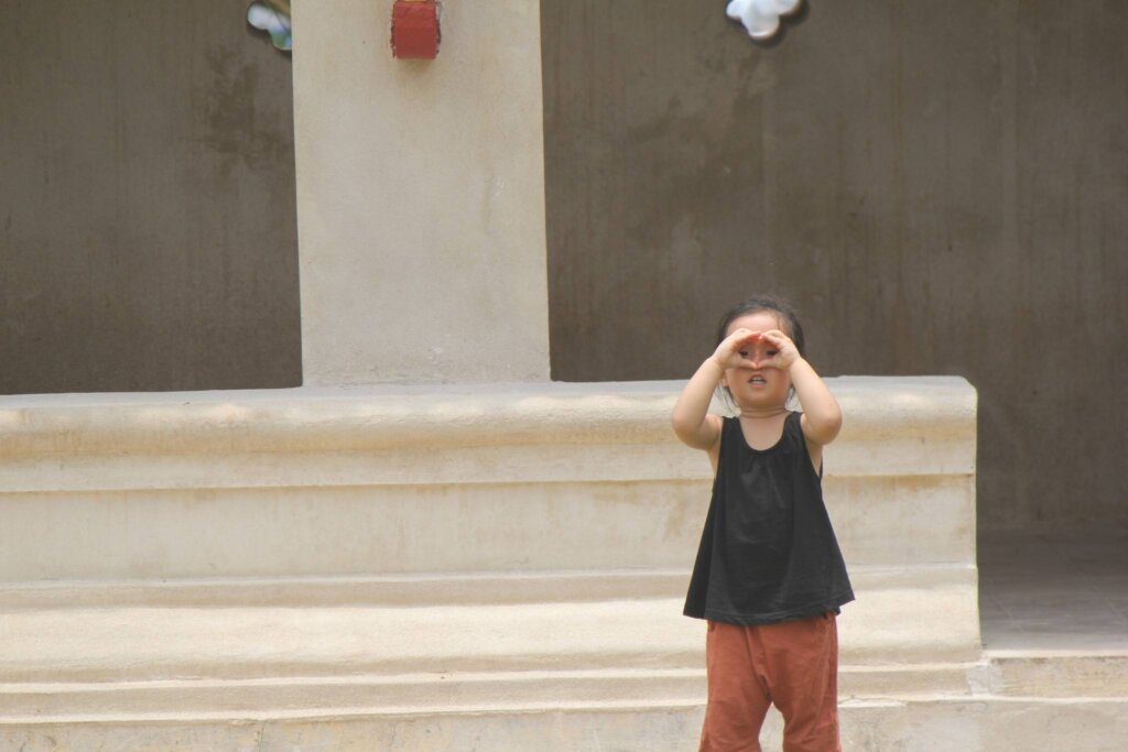 Sweetie enjoyed spotting butterflies and playing peek-a-boo at the temple. Look for simple ways to let your child interact with the surroundings to keep them entertained.