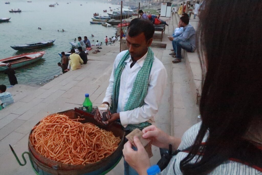 As the sun set, its golden hues illuminated the narrow streets of Varanasi. On our way to the ghat, we grabbed some local snacks. Julie opted for a spicy treat, but Sweetie wasnโt too pleased with the heat. So, we chose a plain, crunchy ramen-like snack for her to nibble on. With her tiny hands busy, we meandered through the bustling alleys toward the river.