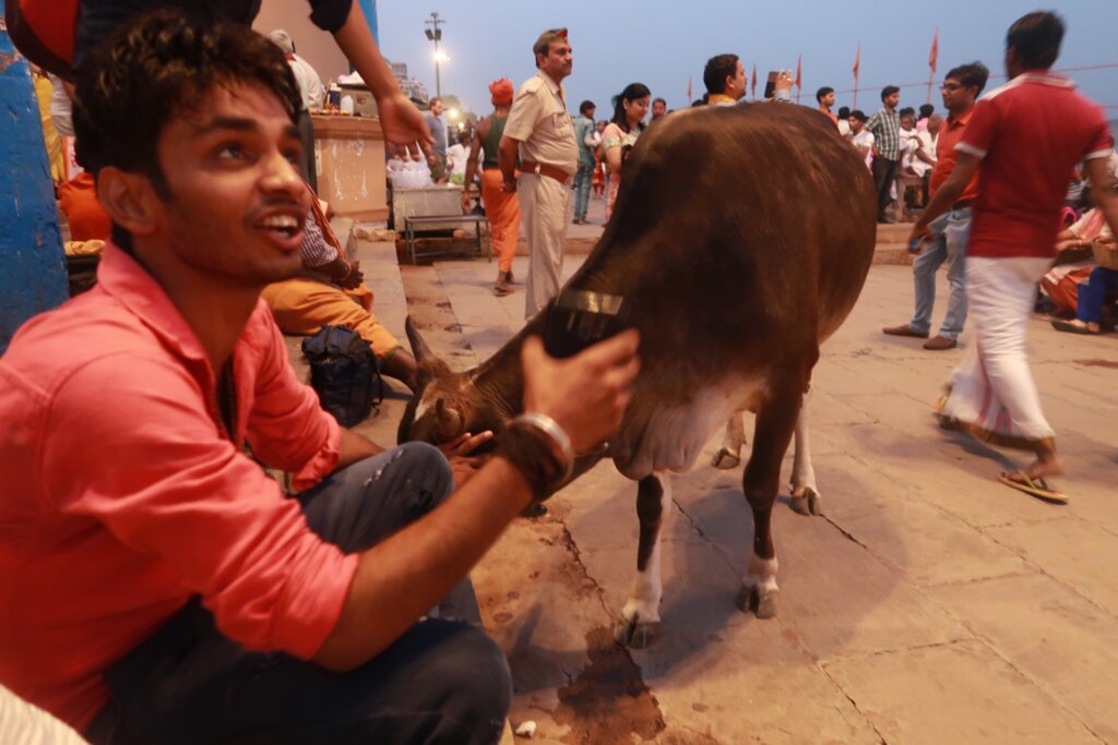 We couldnโt help but chuckle when a sacred cow wandered into the group. The young men scrambled to move it along, with mixed success. Thankfully, some nearby adults intervened before the cow reached our spot!