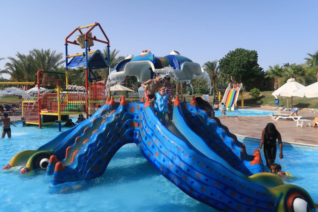 Check that the hotel has shallow pools, baby slides, and shaded areas. Sweetie was more comfortable when we joined her, so shared family areas are a must.