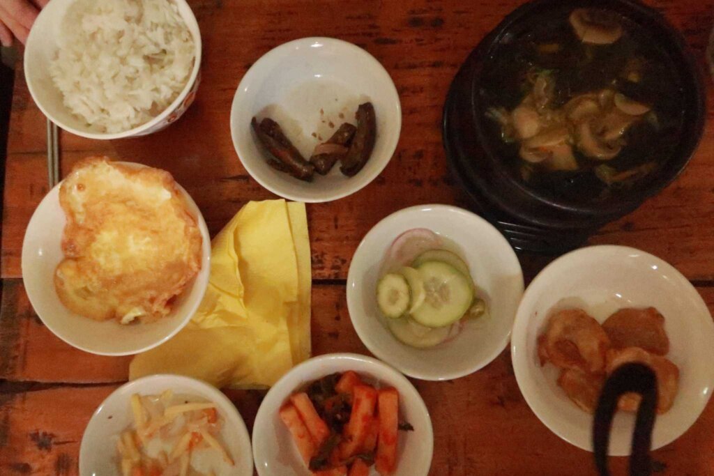 The sight of the air-conditioned room was pure bliss. We stood under the cool air, letting the refreshing chill clear our minds. After settling in, we noticed some fellow travelersโwhom we had met on the boatโenjoying fruit downstairs. Soon, we found ourselves joining them for lunch at a Korean restaurant in the heart of the city.