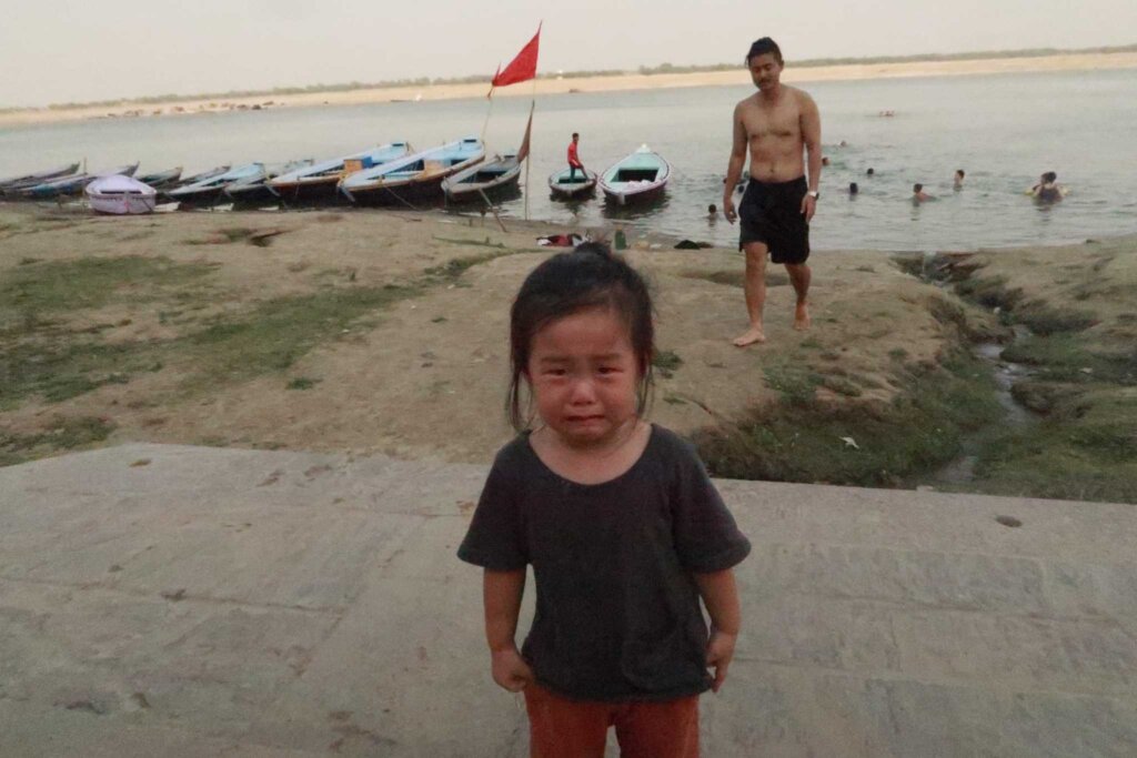The ghat turned out to be a childrenโs swimming class area, and we soon made way for their lessons. We relocated to a nearby sandbar, where local children frolicked in the water like playful seals.