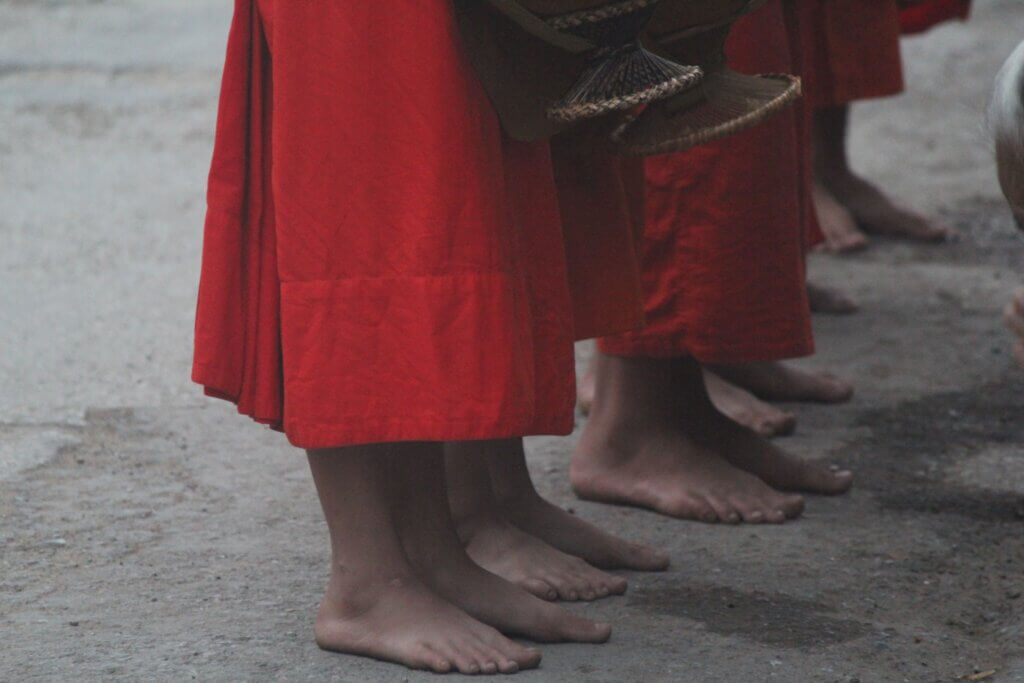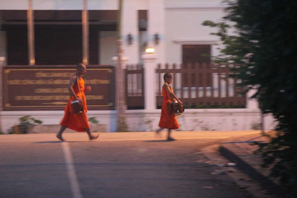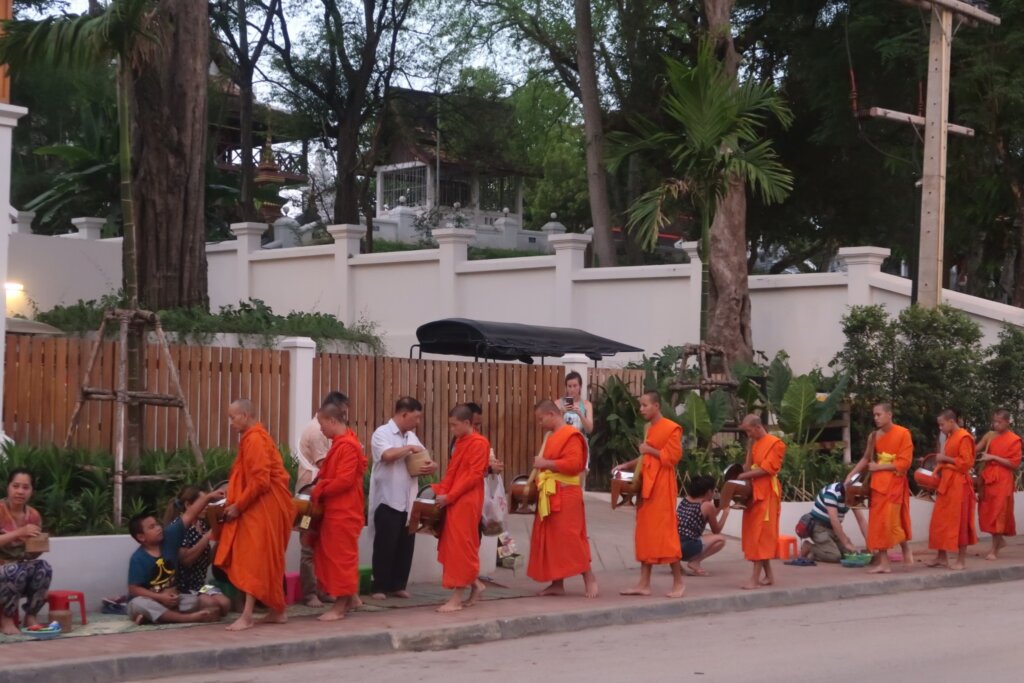 As the ceremony unfolded, we noticed the quiet reverence of the locals and the poignant simplicity of this Buddhist practice. The monks, walking in small groups from different temples, wove through Luang Prabangโ€™s streets. The lead monk in each group, typically the most senior, set the tone for the procession.