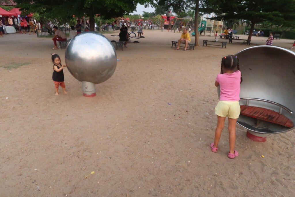 The playground comes alive as the night market gears up. Arriving early lets your baby enjoy the area before the crowds grow.