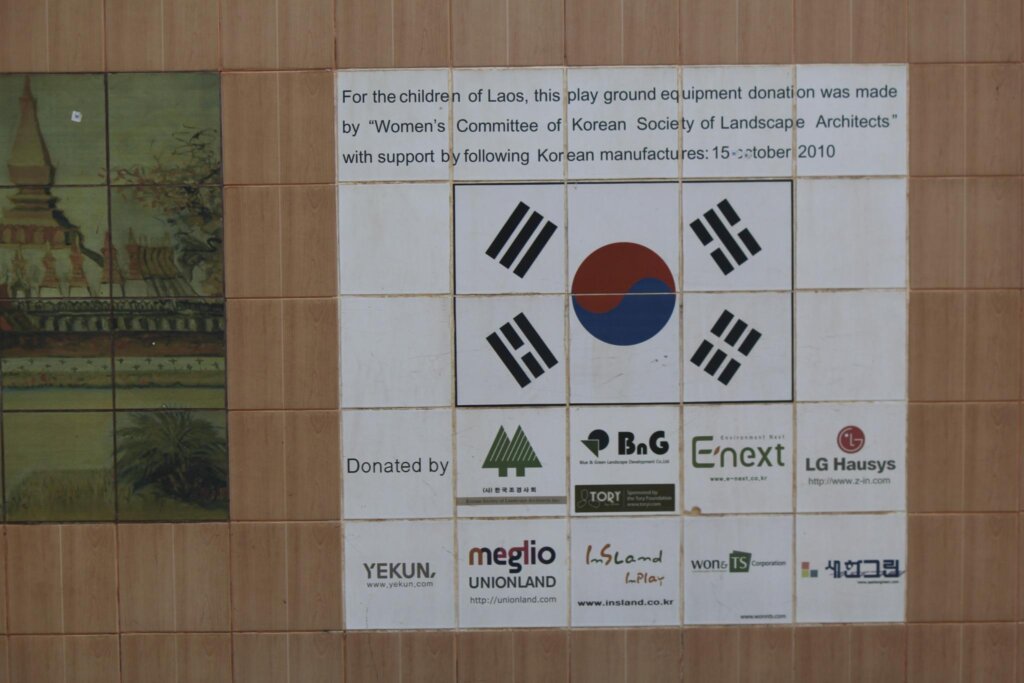 A heartwarming surprise awaited us—a large sign proudly displaying the flags of Laos and South Korea. This playground, we discovered, was built in 2010 through a collaboration between the Korean Landscape Architecture Women’s Association and local sponsors, as a gift to the children of Laos.