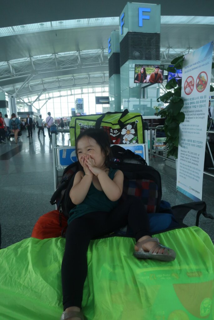 While Julie managed her 18kg backpack like a pro, Sweetie kept herself entertained riding a luggage cart around the terminal. Watching her laugh and play reminded us why traveling as a family is so rewarding—even during hectic moments.