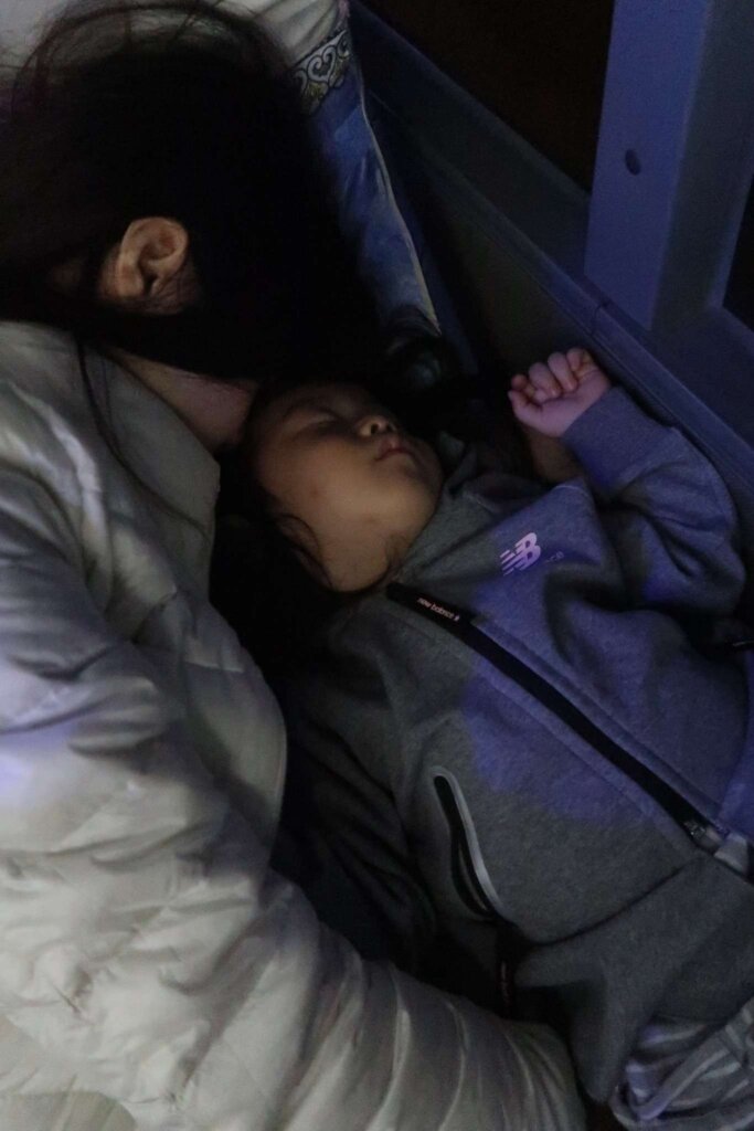 The bus journey was far from smooth. Each seat had a speaker that blasted movies for two hours, making it hard to rest. Sweetie, like most toddlers, found it challenging to sit upright for long and repeatedly attempted to lie down, adding to the difficulty of the night.